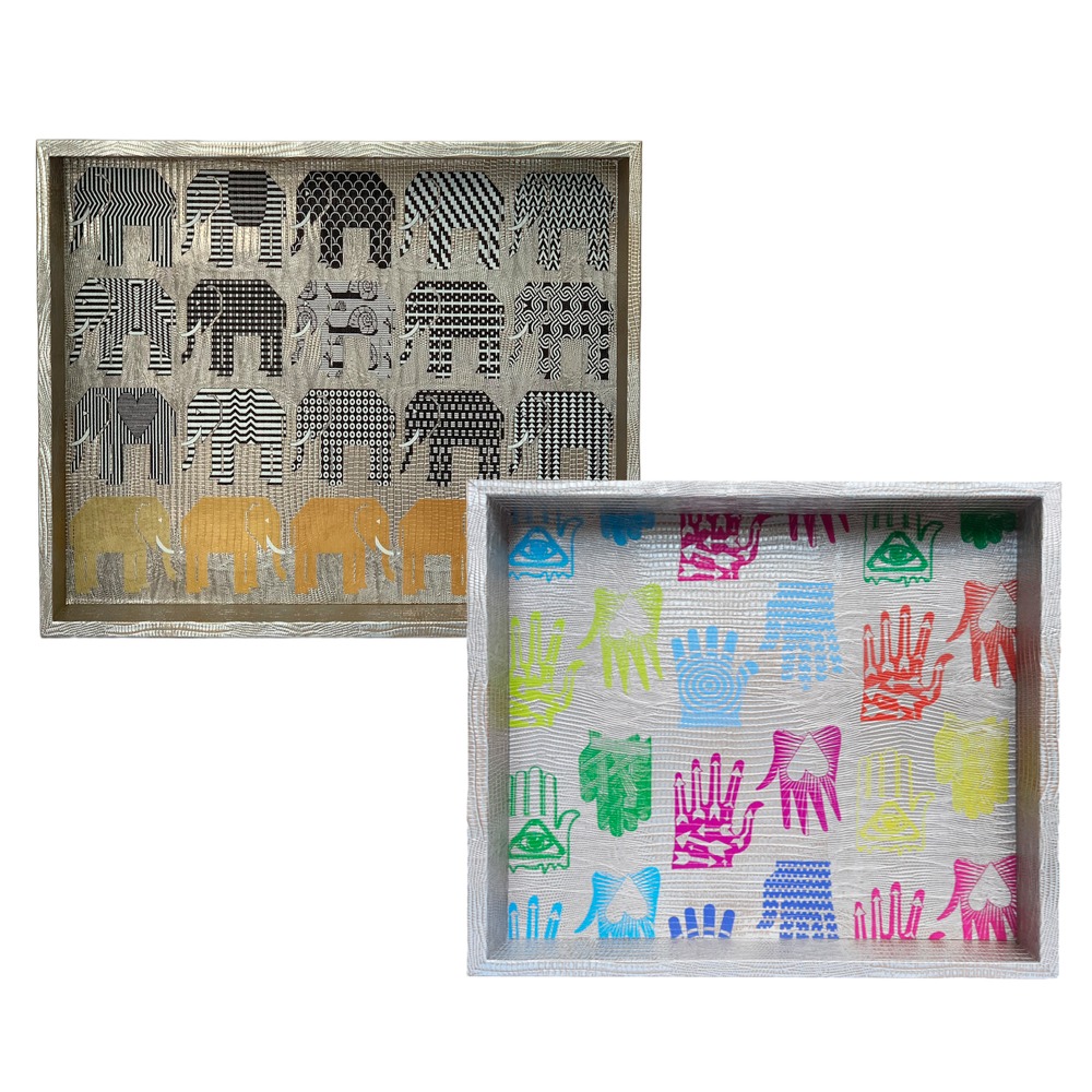 This extra large tray covered in warm silver faux leather with a lizard-like texture is a unique and elegant piece, handmade by talented Mexican artisans. Its multifunctional design makes it the perfect piece for creating a sophisticated bar, as support for the ottoman, or simply to use as a bold decorative item in your home. It pairs perfectly with our wooden scissors — the perfect combination!