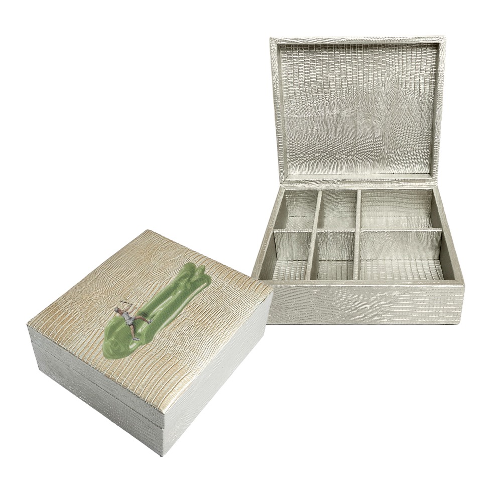 This jewelry box for the nightstand is a unique and exclusive piece, handmade by talented Mexican artisans. Its beige faux leather design with a lizard-like texture makes it an incredible and modern decorative element that will add a touch of elegance to any space where you decide to place it: whether on your nightstand, dressing room, bedroom, or bathroom. This product is a collaboration with visual artist Tay Xacur, who not only creates but transforms. Inspired by nature and driven by what moves her soul, each piece is a window into her inner world. In Tay‘s universe, every brushstroke tells a story, every form has life. She, also an extraordinary athlete, was a key part in the creation of our sports collection. With multiple compartments and spaces to organize your jewelry pieces in an orderly way, this product is not only perfect for you but also an ideal gift for any age. Every detail of this jewelry box has been carefully considered to create a harmonious and pleasant atmosphere. Its meticulous focus on functionality, authenticity, and quality makes it a true work of art that cannot be missing from your accessory collection. Don‘t wait any longer and make this incredible jewelry box for the nightstand yours! Measurements: 7cm height x 15cm width x 17.5cm length Clean with a damp cloth, without chemical products.