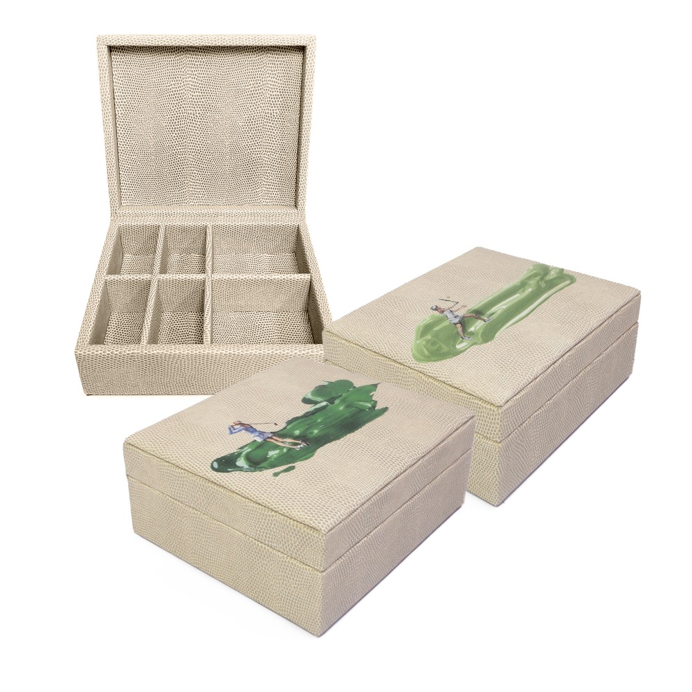 This jewelry box for the desk is a unique and exclusive piece, handmade by talented Mexican artisans. Its imitation beige leather design with lizard texture makes it an incredible and modern decorative element that will add a touch of elegance to any space where you decide to place it: whether it‘s on your desk, dressing room, bedroom, or bathroom. This product is a collaboration with the plastic artist Tay Xacur, who not only creates but transforms. Inspired by nature and driven by what moves her soul, each piece is a window to her inner world. In Tay‘s universe, each brushstroke tells a story, each shape has life. She, also an extraordinary athlete, was a key piece in the creation of our sports collection. With multiple compartments and spaces to organize your jewelry in an orderly manner, this product is not only perfect for you, but also an ideal gift for any age. Every detail of this jewelry box has been carefully thought out to create a harmonious and pleasant environment. Its meticulous focus on functionality, authenticity, and quality makes it a true work of art that cannot be missing from your accessories collection. Don‘t wait any longer and make this incredible jewelry box for the desk yours! Measurements: 7cm height x 15cm width x 17.5cm length Clean it with a damp cloth, without chemicals.