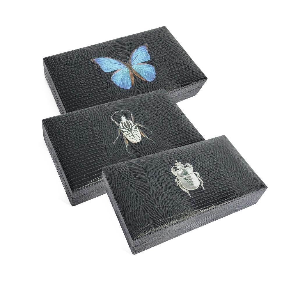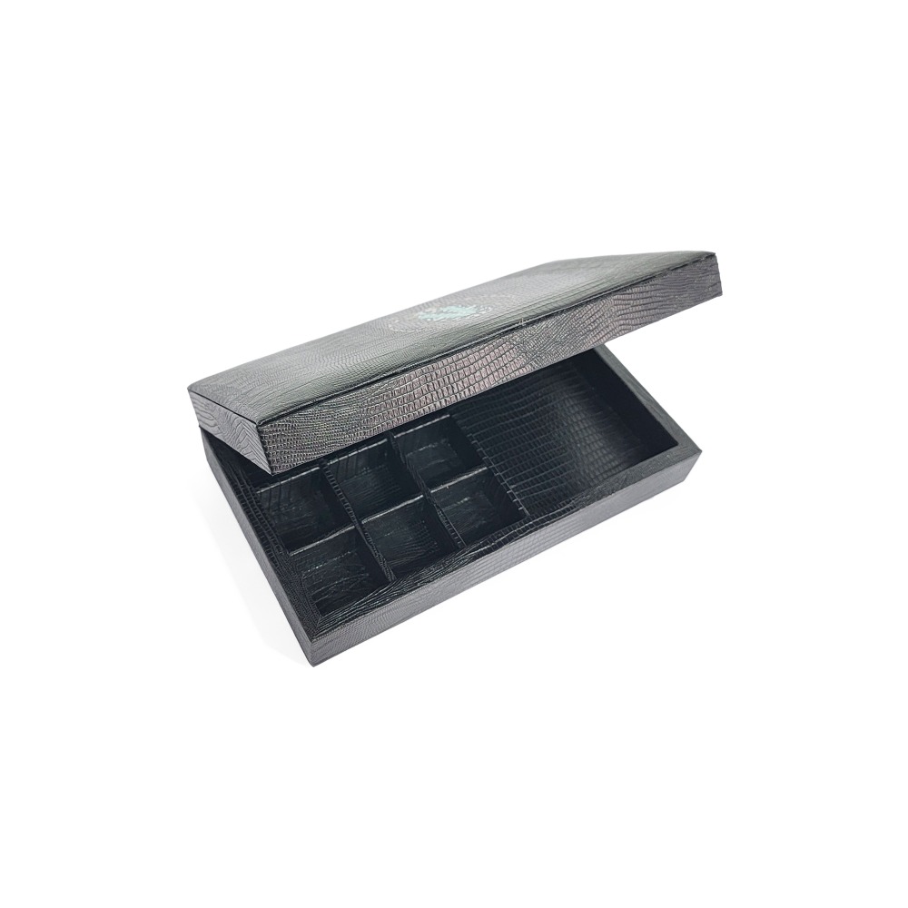 This incredible rectangular jewelry box in black faux leather with armadillo texture is perfect for storing your jewelry with style and organizing your cufflinks in a unique way. Handmade by Mexican artisans, this jewelry box is a true work of art that combines luxury and functionality.
