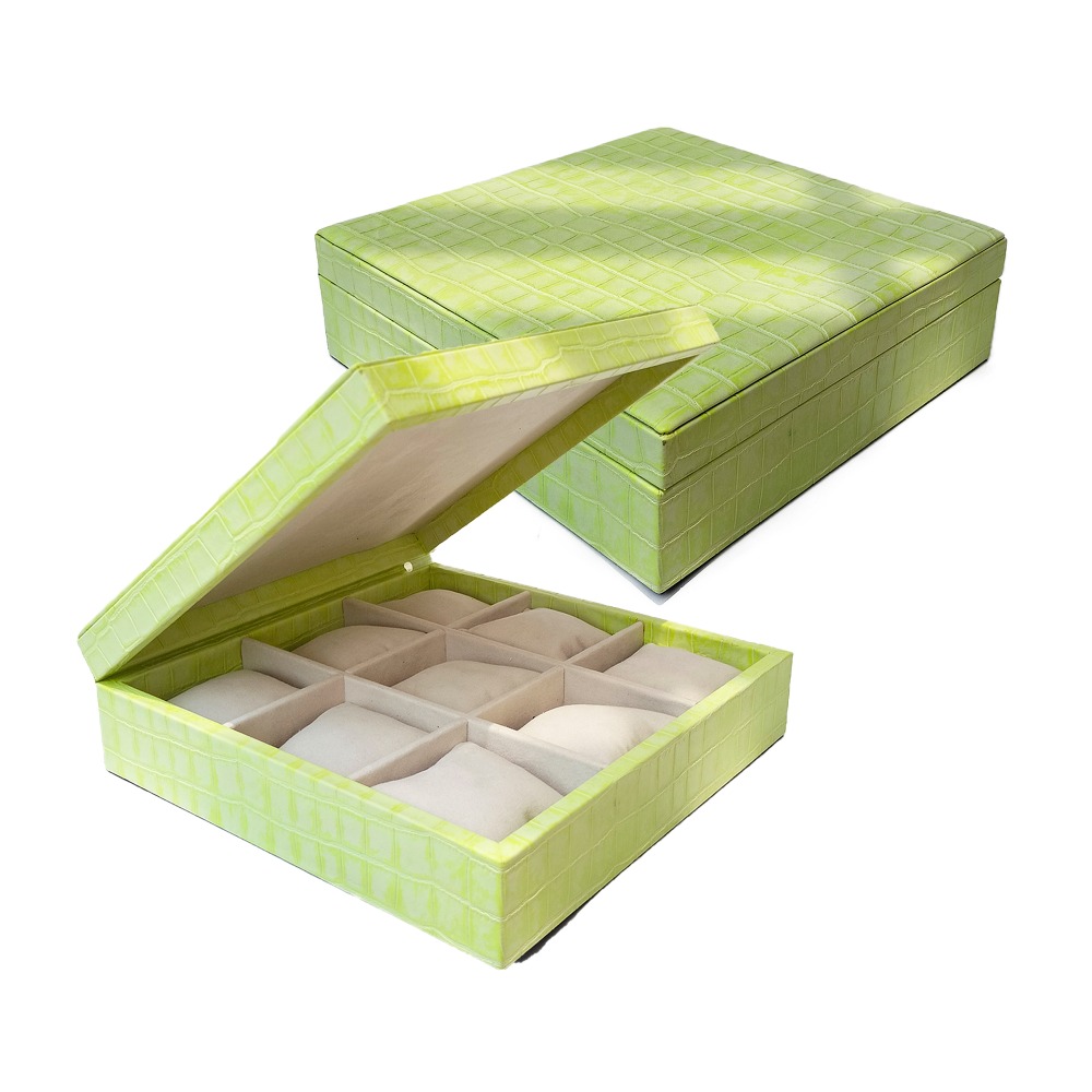 We present our incredible watch box, a unique piece that stores your most precious treasures in style. Handmade by Mexican artisans in crocodile-textured leather, this watch case has 9 individual slots, a suede interior lining, and cushions for each watch, and it‘s even excellent for storing your bracelets safely and neatly.