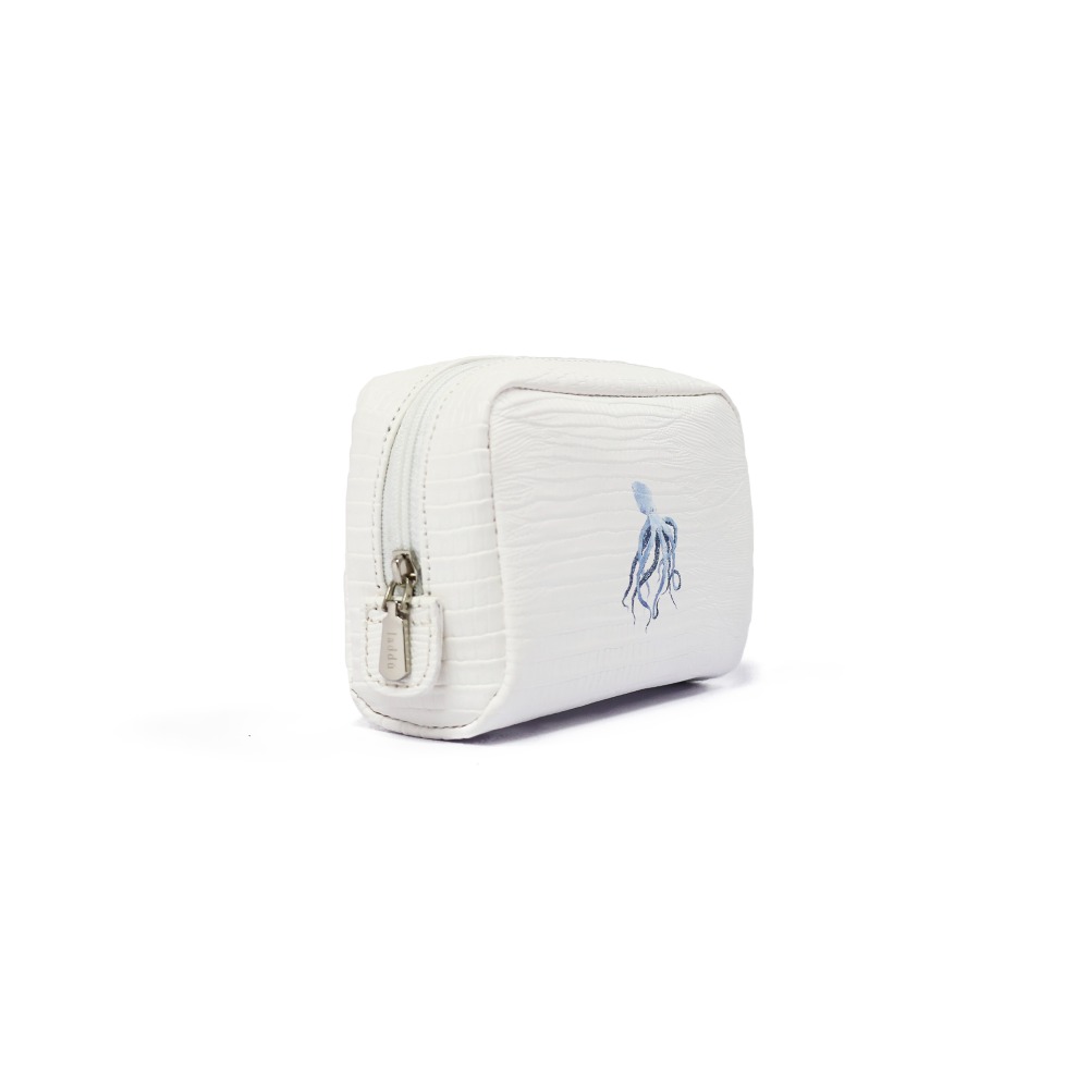 Fall in love with our incredible mini pouch-style case, the perfect accessory to carry in your handbag and store your essentials such as hand cream, chapstick, lipstick and blush and even use as a pill case. This small but indispensable pouch is handmade by Mexican artisans in snow-colored faux leather with an armadillo-like texture, and features a printed design for a fun pop of color. Also, thanks to its super practical size it has a personalized zipper pull with the Laddu logo.
